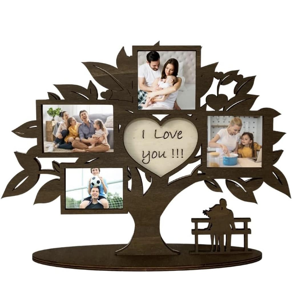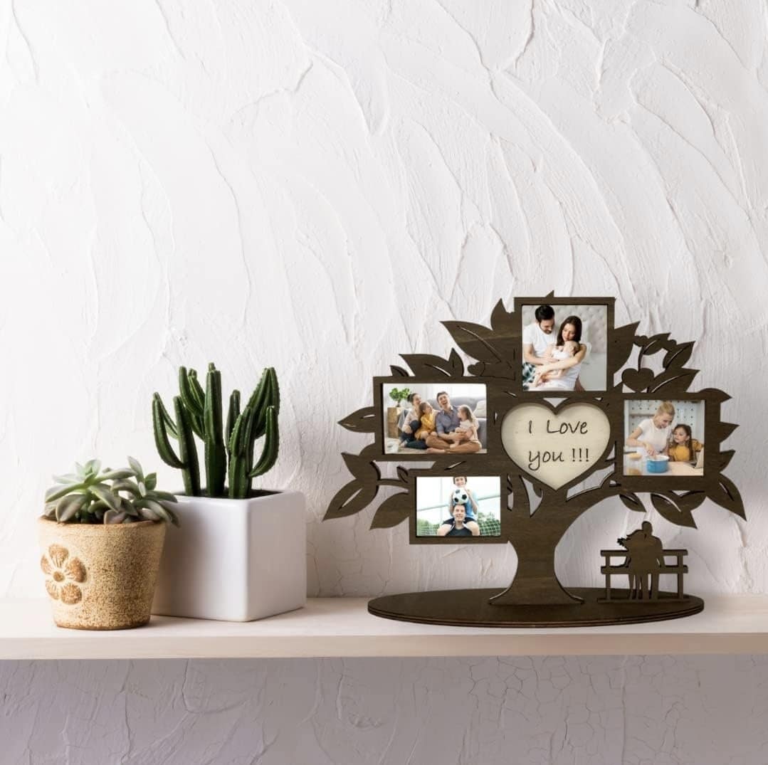 Conserva i tuoi ricordi più belli in questa elegante cornice a forma di albero della vita, realizzata artigianalmente in legno. Dotata di 5 spazi per foto (una centrale a forma di cuore), è perfetta per arredare casa o ufficio con un tocco di calore familiare. Facile da montare grazie ai pratici gancetti posteriori, è disponibile nei colori noce, bianco o nero. Idea regalo ideale per mamma, nonna, fidanzata o per ricorrenze come Natale, compleanni e anniversari. Personalizzabile con una dedica centrale.