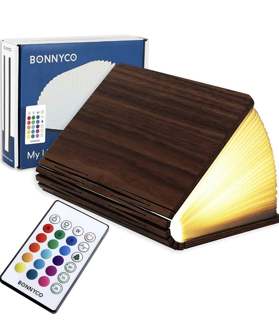 BONNYCO Lampada Libro Led Pieghevole in Legno con Telecomando 16 Colori e Timer
